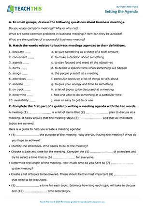 In this free business meetings worksheet, students practice language a chairperson would use for beginning a meeting. First, students put the tasks a...