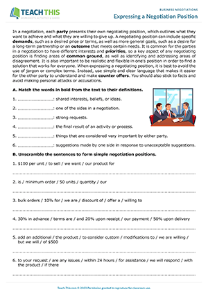 In this useful negotiation positions worksheet, students learn and practice expressing simple negotiation positions. First, students match keywords related to...