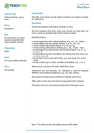 This ESL word game can be used to practice or review a variety of vocabulary. Tell the students that they have one minute to write down as many words as possible that match certain criteria, e.g. words beginning with certain prefixes, certain...