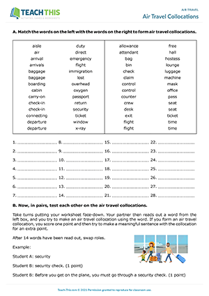 ESL Air Travel Collocations Activity - Vocabulary Exercise: Matching, Forming Collocations - Speaking Game: Forming Collocations and Sentences - Pair Work