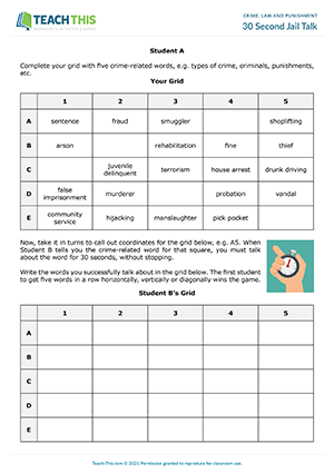 In this fun crime vocabulary game, students talk about crime-related words for one minute. The activity covers types of crime, criminals and punishments. In pairs, students begin by adding five crime-related words of their own to their grid on the...