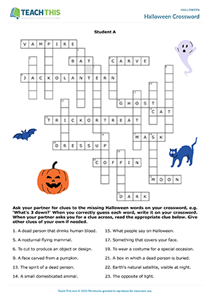 In this useful Halloween vocabulary activity, students complete a crossword by listening to clues and guessing Halloween vocabulary. In pairs, students take it in turns to ask their partner for a clue to one of...