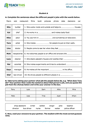 ESL Jobs Game - Vocabulary and Speaking: Gap-fill, Information Gap, Asking and Answering Questions, Guessing, Controlled Practice - Pair Work